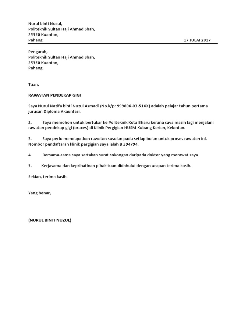Contoh Surat Rasmi Permohonan Pertukaran Tempat Belajar Disebabkan Rawatan Hospital Pdf